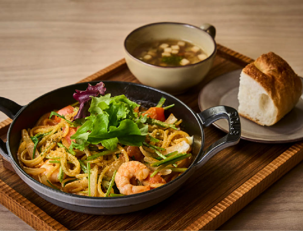 焼きパスタに季節のスープとフォカッチャ、さらにドリンクバーをお楽しみいただけます。